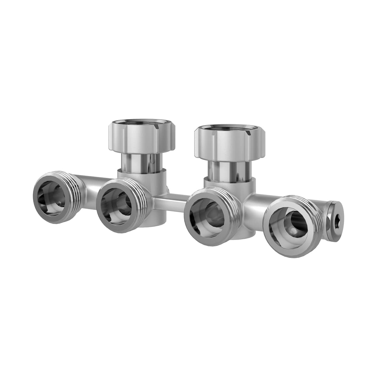 Der Vierfachverteiler Eckform mit Steg hat die Abstände: 40 - 50 - 40 mm. Erhältlich in Messing vernickelt.