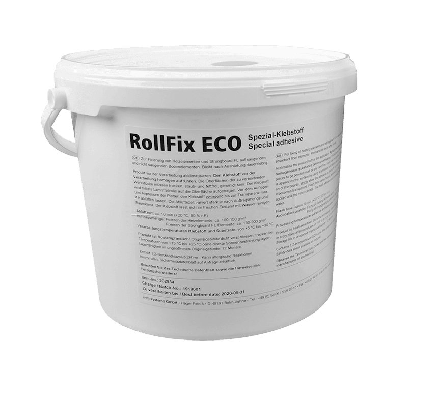 Rollfix ECO zur Fixierung der Heizelement und Strongboard bei Direktverlegungen zur Erstellung des Verbunds. Bedarf Fixierung Heizelemente 0,1 kg/m², Bedarf Fixierung Strongboard 0,15 kg/m²; Konsistenz: cremig; Farbe: hellbeige. Dichte: ca. 1,07 g/cm3 Festkörpergehalt: 71% Verarbeitungstemperatur: von +15° C bis +35°C Ablüftezeit: je nach Verwendungszweck 20 Minuten bis 12 Stunden. Begehbar: sofort nach der Verlegung. Belastbar: sofort nach der Verlegung D1 lösemittelfrei gem. TRGS 610 Lagerung: 24 Monate frostfrei lagerfähig