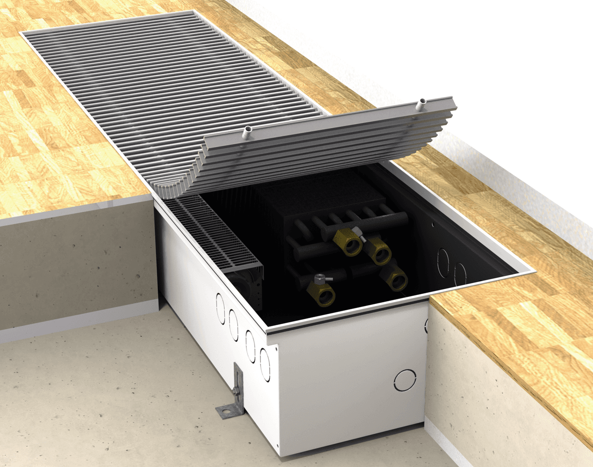 F4C-Konvektoren mit Trafo (Drehzahlregler) in der Konvektorwanne bestehen aus einem standardmäßig schwarz lackierten Kupfer- und Aluminium-Wärmetauscher, der in einer Edelstahlschale montiert und im Innenraum ebenfalls standardmäßig schwarz lackiert ist. INTRATHERM F4C-Konvektoren sind je nach Länge des Wärmetauschers mit leisen Ventilatoren ausgestattet und in der Wanne neben dem Wärmetauscher montiert. Die Ventilatoren sind mit einem 24V-Motor ausgestattet. Diese Ventilatoren sorgen für eine erhöhte Leistung sowohl beim Heizen als auch beim Kühlen von Räumen. Der in der Wanne verbaute Trafo befindet sich auf der gegenüberliegenden Seite der Vor- und Rücklaufanschlüsse. Oben wird der Konvektor durch ein Abdeckgitter aus Holz oder Metall geschützt und die Gitteroberfläche kann aus Buche oder Eiche, natur oder lackiert, oder Edelstahl ausgeführt werden. Die Aluminiumroste sind in verschiedenen Farben, natur, hellbronze, dunkelbronze oder schwarz verfügbar. Dieses Gitter ist separat zu bestellen. Der Anschluss des Wärmetauschers an die Anlage erfolgt über zwei G 1⁄2"-Innengewindeanschlüsse. Die elektrische Steuerung dieser Konvektoren erfolgt über elektrische Raumthermostate mit Drehzahlsteller in Verbindung mit dem in der Wanne verbauten Trafo. Hinweis: Für Poolanwendungen sind spezielle Schwimmbadversionen erforderlich. Es ist verboten, F4C direkt an das 230-V-Netz anzuschließen. Es ist zwingend erforderlich, die verbauten Transformatoren zu verwenden. Die maximale Länge mit einem Wärmetauscher beträgt 325 cm.